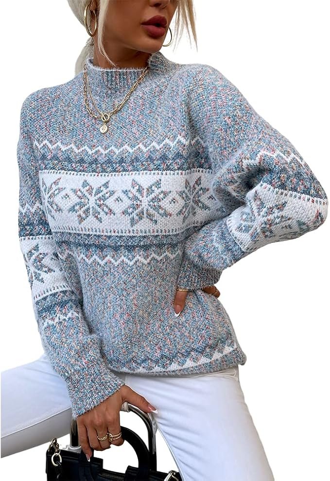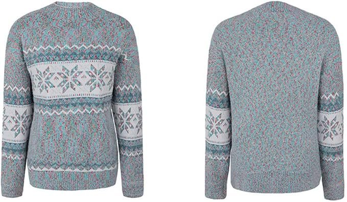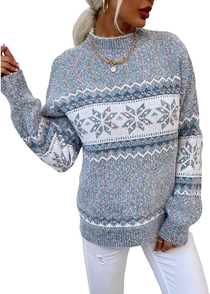 Embody the spirit of the holidays with the stunning Christmas snowflake pattern featured on this sweater. Its rounded neckline and long cuffed sleeves offer a classic look that pairs beautifully with its waist-length hemline, complete with ribbed knit detailing. The loose-fit design ensures a relaxed yet chic feel, making this pullover a go-to piece for layering or standing out at holiday gatherings.