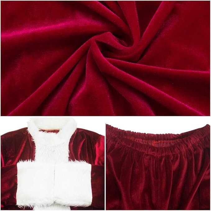 Flexible, Comfortable Fit: Designed to fit most adults, the velvet Santa suit features a stretchy 26.7–45.3″ waist and roomy measurements (Coat Length: 32.7″, Bust: 55.1″, Sleeve: 22.4″, Pants: 39.4″), making it ideal for men and women between 5’7″–6’1″ tall and under 220 lbs.