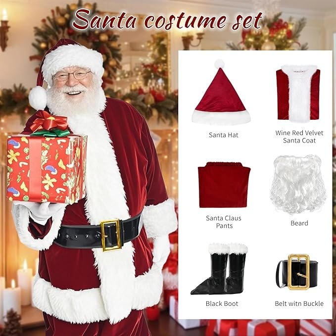 Complete 9-Piece Santa Costume Set: This deluxe Santa Claus outfit for adults includes a plush red coat, matching pants, classic Santa hat, black belt, white beard, and boot covers — everything you need to bring Santa to life this holiday season.
