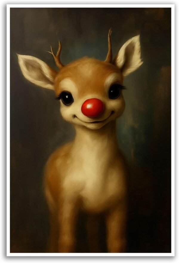 This delightful artwork showcases Rudolph the Red-Nosed Reindeer in a whimsical, storybook style — a perfect choice for those who adore festive cheer and lighthearted charm. Its soft colors and endearing expression make it a heartwarming piece that resonates with both children and adults alike.